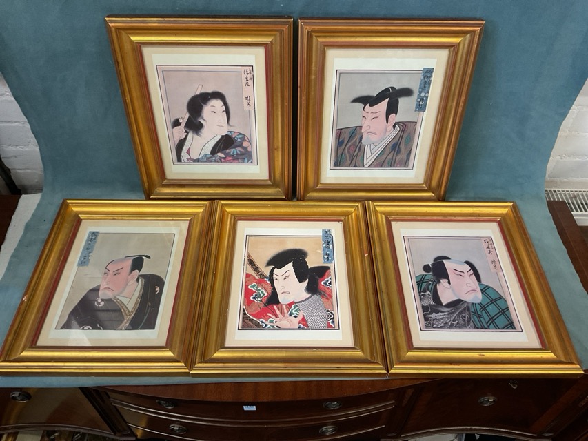 Five coloured prints after Japanese paintings by Shorakusai, depicting edo period actors in role, gilt framed. (8.75in x 12in) (5)