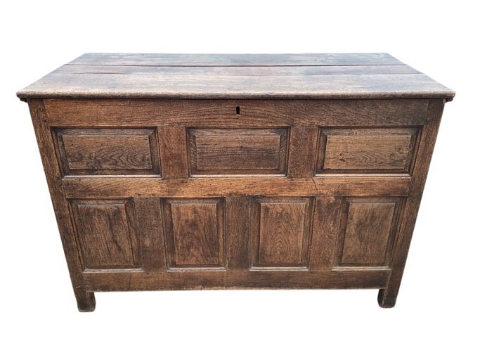 An C18th oak coffer with three-board top, of pegged construction with fielded panelled front and sides, raised on stile feet. (51in x 24in x 34in)