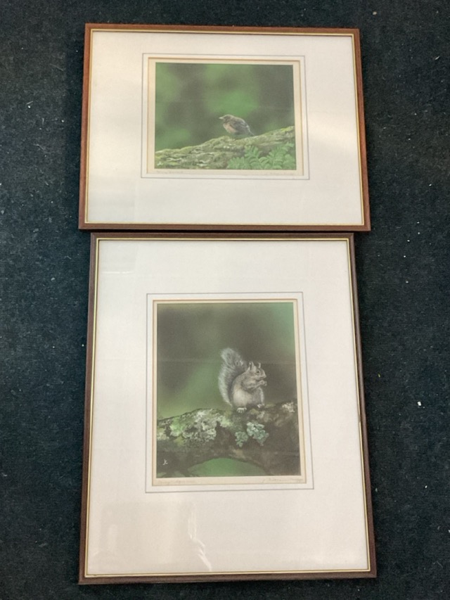 J Kirkham-Knaggs, gouaches, a pair, a blackbird on log, titled Young Blackbird on the mount, and a squirrel on branch, titled Grey Squirrel on the mount, each signed and framed. (2)