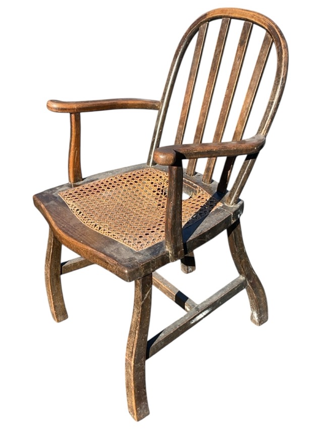 An arts and crafts beech armchair with hooped slatted back above a serpentine fronted caned seat flanked by outscrolled arms, raised on curved legs joined by stretchers.