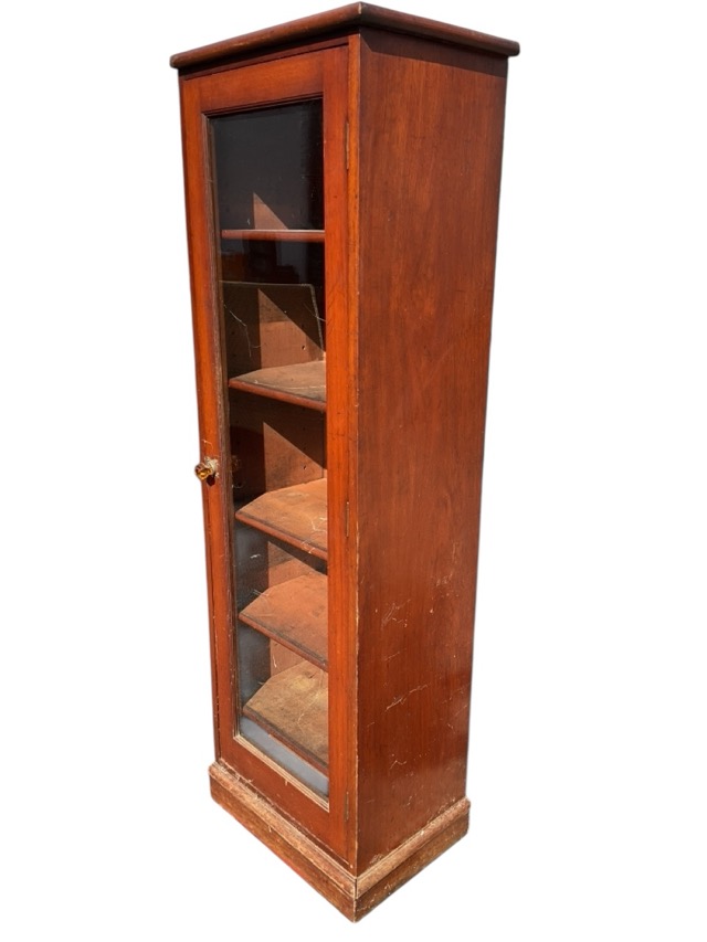 A Victorian mahogany display cabinet with rectangular top above a tall glazed door with amber glass handle enclosing shelves, raised on a plinth. (18.5in x 13.5in x 62,75in)