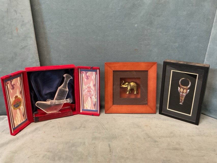 An Omani velvet cased military glass presentation trophy in the form of a traditional khanjar dagger; a box framed gilt figure of an Indian elephant; and a box framed miniature Cameroonian tribal mask. (3)