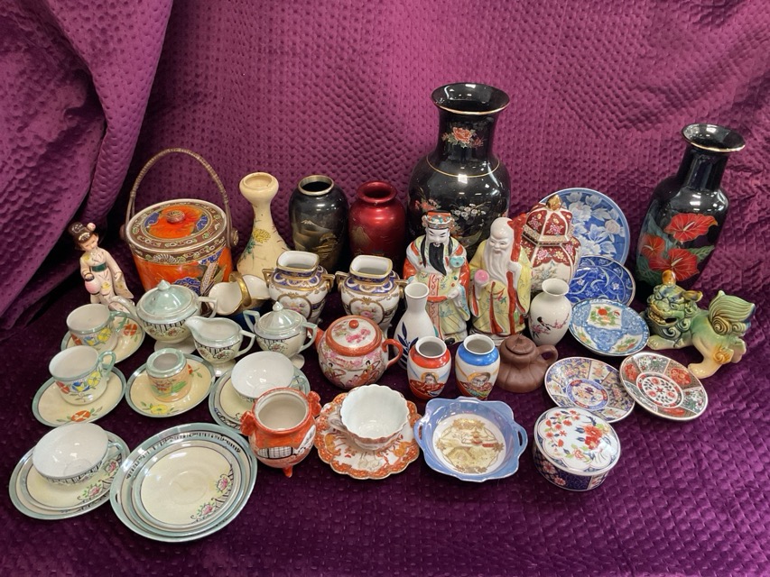 Miscellaneous oriental ceramics - vases, cups & saucers, bowls, a pair of Noritake floral gilt vases, part coffee sets, a sancai glazed stoneware lion, a pair of bearded immortal figurines, a Satsuma biscuit barrel & cover, a miniature redware teapot, etc. (A lot)