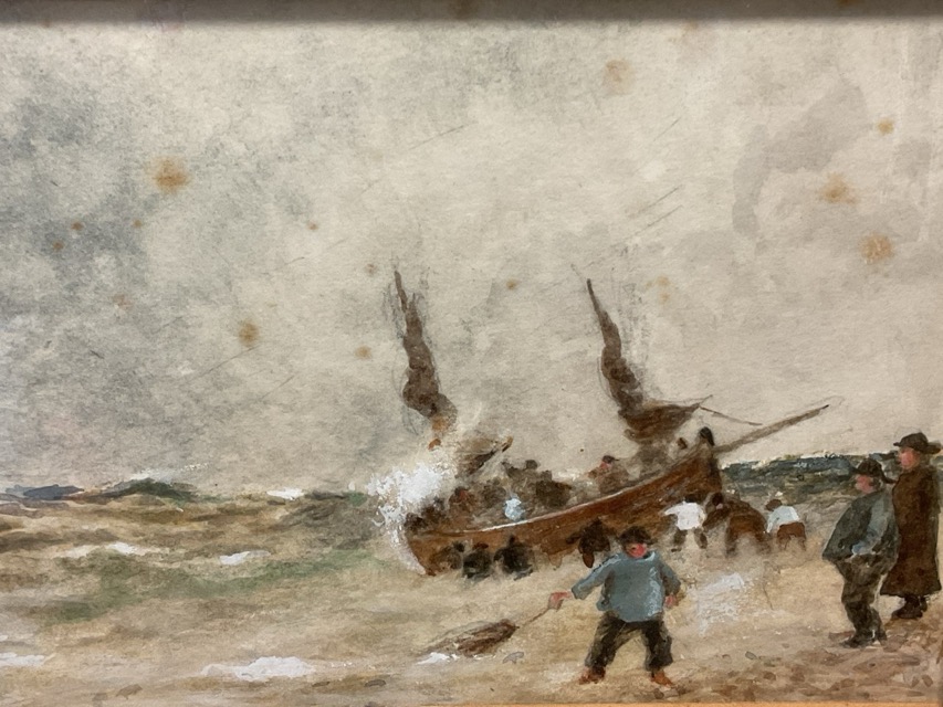 Henry Keene, Victorian watercolour, beach scene with figures and boat, inscribed to verso - lifeboat launch, pencil attribution on mount dated 1875, mounted & framed. (6.5in x 4in)