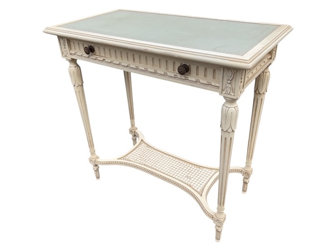 A painted ladies writing desk with gilt tooled leather skiver to rectangular moulded top, having fluted frieze drawer raised on leaf carved tapering ribbed legs joined by caned panelled stretcher - purchased Harrods 1970s. (29.5in x 16in x 29in)