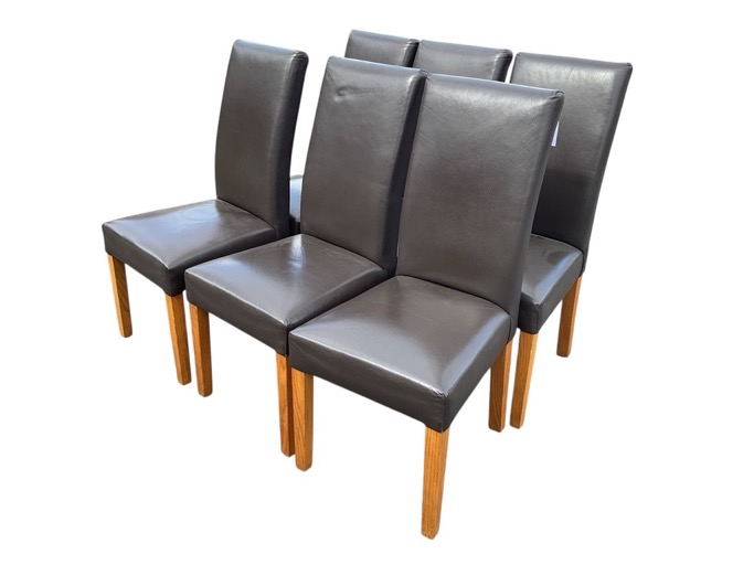 A set of six contemporary oak high-back leather upholstered dining chairs with sprung seats. (6)