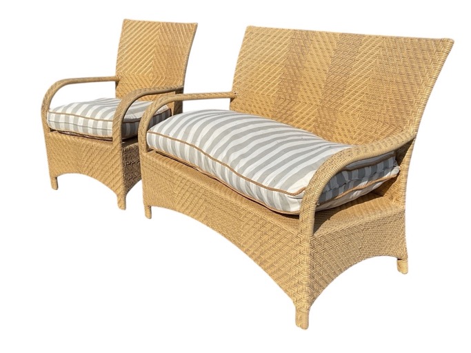 A woven faux cane two-seater patio sofa and armchair, the rectangular backs and seats with loose cushions flanked by curved arms above arched aprons, raised on rectangular feet. (2)