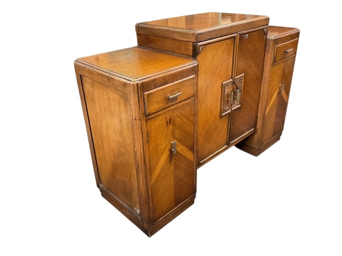 A 30s oak cocktail cabinet, the raised central section with hinged top above a pair of doors enclosing a mirrored fitted interior, flanked by pedestals with frieze drawers and cupboards. (53in x 18.5in x 37.5in)