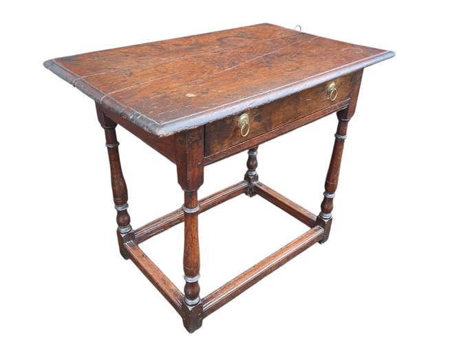 A William & Mary oak side table with moulded rectangular overhanging top above a frieze drawer with original brass ring handles, raised on baluster turned legs joined by stretchers. (31in x 20in x 26in)