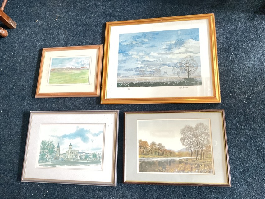 Four mounted framed coloured prints - John Harvey, landscape with oast houses, numbered and signed, John Martin, Tweed and the Eildons, titled and framed, J Walker, Dunbar golf course, and bell, view of Stockbridge Edinburgh. (4)