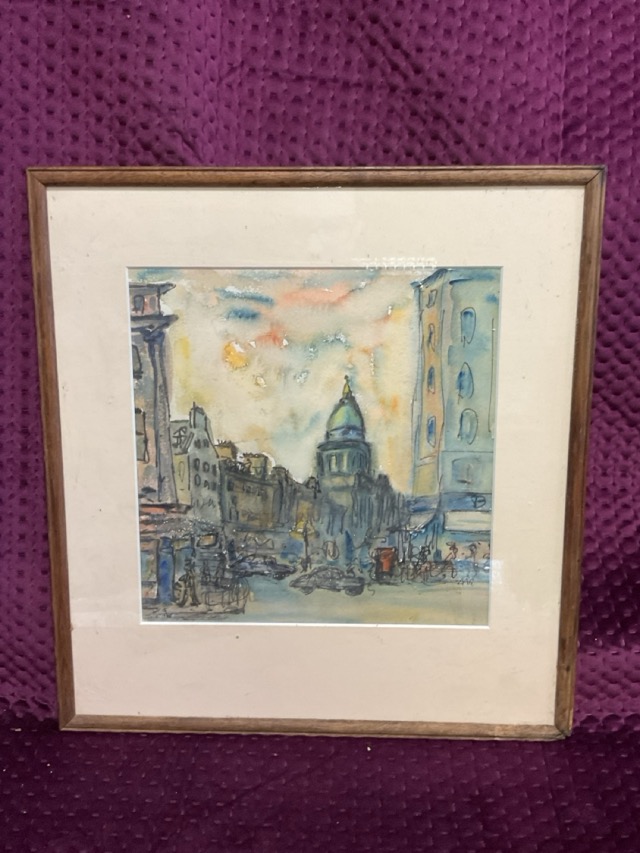 Pen, ink & watercolour wash, streetscape with figures & cars, signed with initials AAG, mounted and oak framed. (9.75in x 9.75in)