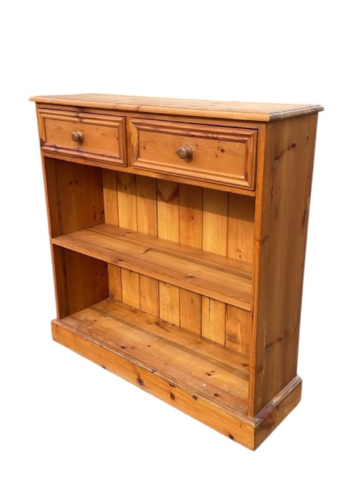 A pine bookcase with rectangular moulded top above two knobbed panelled drawers, and open shelves with tongue & grooved back, supported on a plinth. (39in x 11.75in x 39.5in)