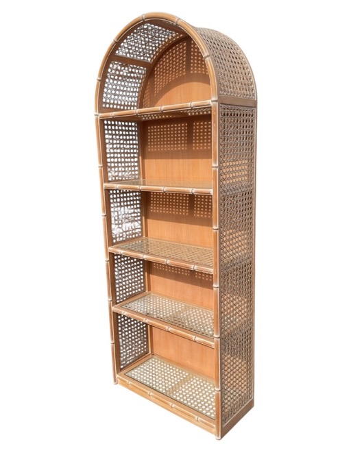A limed faux bamboo set of shelves with arched frame to caned panels, having five rectangular glass shelves. (30.75in x 13.5in x 78in)