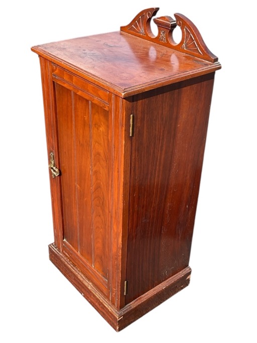 A Victorian walnut bedside cabinet with raised arched broken pediment back and rectangular moulded top above a grooved panelled door, on a plinth. (15.5in x 12in x 33.5in)