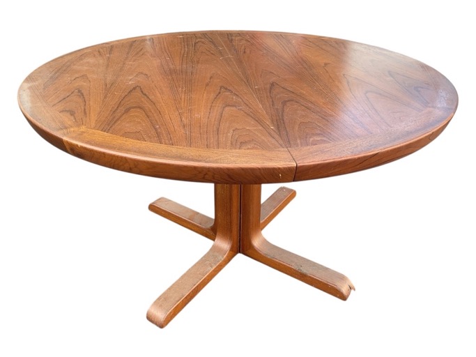 A Danish teak circular extending dining table by Skovby, with crossbanded demilune ends raised on L-shaped supports - no leaf. (49in x 49in x 29.5in)