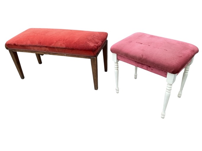 A rectangular 3ft oak stool with sprung upholstered seat on square tapering legs - 36.5in; and a painted dressing table stool on turned legs with cushion seat - 21in. (2)