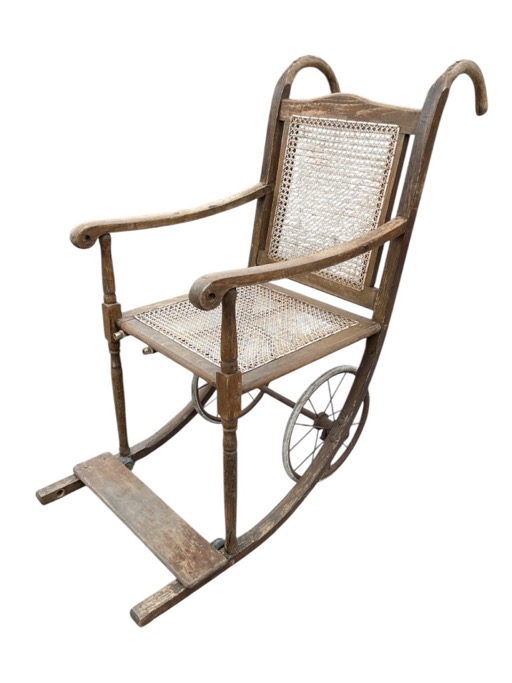 An Edwardian beech wheelchair with caned back & seat supported on spoked wheels, the back with shaped push-along crook handles, the arms on turned supports above a footrest.