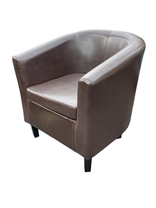 A modern horseshoe shaped leather upholstered armchair with cushion seat, raised on square tapering ebonised legs.