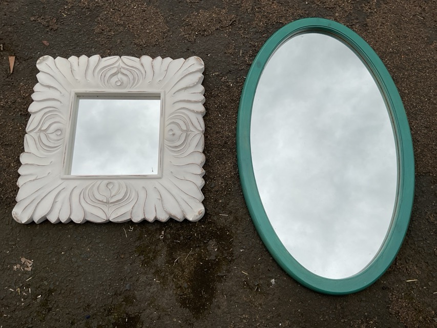 A modern square mirror in deep leaf moulded painted frame - 23.5in; and an oval mirror in painted frame - 39in. (2)