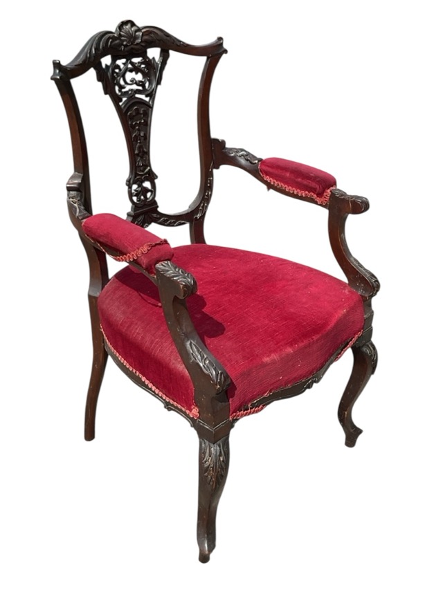A late Victorian carved salon chair with acanthus shell back above a pierced ribbon splat, the conforming arms with elbow pads, above a sprung upholstered seat, raised on cabriole legs.