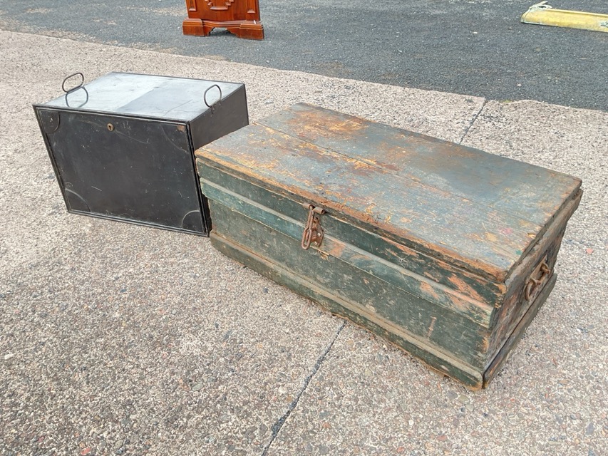 An old Victorian dovetailed painted pine toolbox with interior shelf, mounted with carriage handles - 33.5in; and an Edwardian four-division tin deed box with drop-down panelled cover, having brass lock and twin hinged handles - 21in. (2)