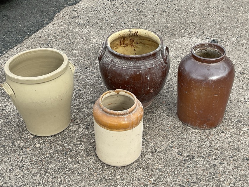 Four Victorian salt galzed stoneware crocks, two with applied moulded handles. (13in) (4)