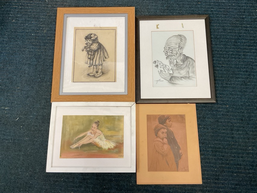 TP Johnston, pencil & charcoal study of a girl with doll, titled Love is Blind, signed, mounted & framed; Jane Carter Waddington, pastel, study of a dancer titled to verso The Ballet Shoes, signed, mounted & framed; a pencil bust portrait of a chinaman reading, signed indistinctly, mounted & framed; and an unframed crayon study of two children, signed indistinctly. (4)