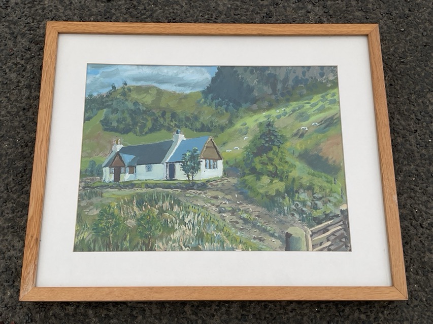 Gouache on paper, gated cottage hillside landscape, unsigned, mounted & framed. (15.25in x 11.25in)