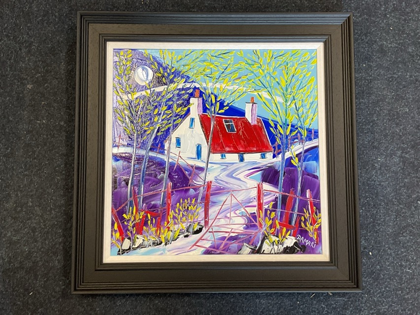 John Damari, oil on canvas, cottage landscape titled Moonlit Night at Joan’s Wee Croft, Ardfern, Argyll to verso, signed and framed. (15in x 15in)