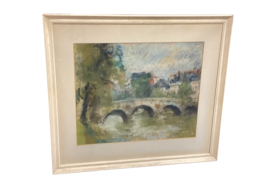 Lara Alixairdg? pastel, impressionist river landscape with bridge and buildings, signed indistinctly, mounted & framed. (20.25in x 16.25in)