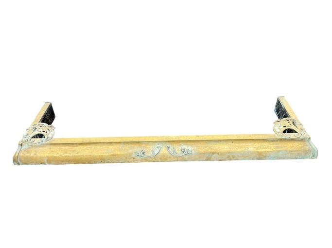 A rectangular brass fender with moulded curb having scrolled mounts, the corners with pierced grill anchor shaped brackets. (53.75in x 15in ext)