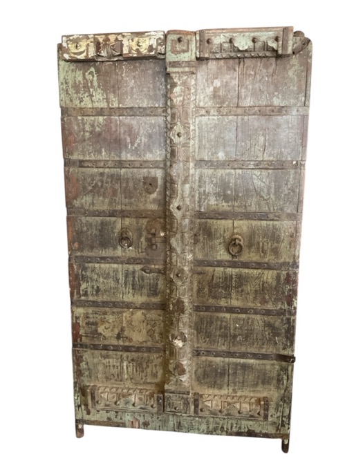 A pair of eastern carved hardwood doors converted to a strong 7ft chunky table with solid square column legs, the doors with iron mounts and ring handles. (83.5in x 46in x 30in)