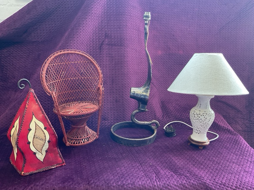 A wrought iron tablelamp assembled from a mattock head; a porcelain baluster vase form tablelamp with allover pierced prunus motif; a Moroccan painted parchment wall light shade; and a miniature bamboo peacock armchair. (4)