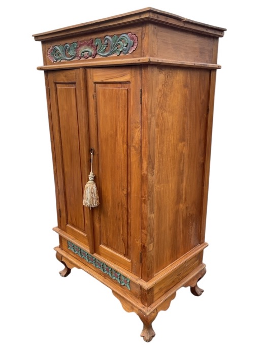 A hardwood cabinet with moulded cornice above a painted foliate scroll carved frieze, having pair of fielded panelled doors below, the base with carved flowerhead painted apron on ball & claw feet. (38.25in x 24.75in x 68.25in)