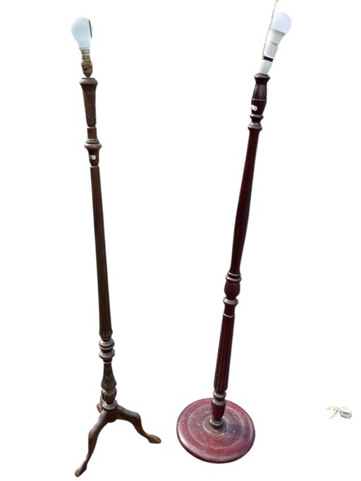 A carved mahogany standard lamp with fluted tapering column on leaf carved tripod with pad feet; and a later stained standard lamp with turned ribbed column on circular base with three bun feet. (2)