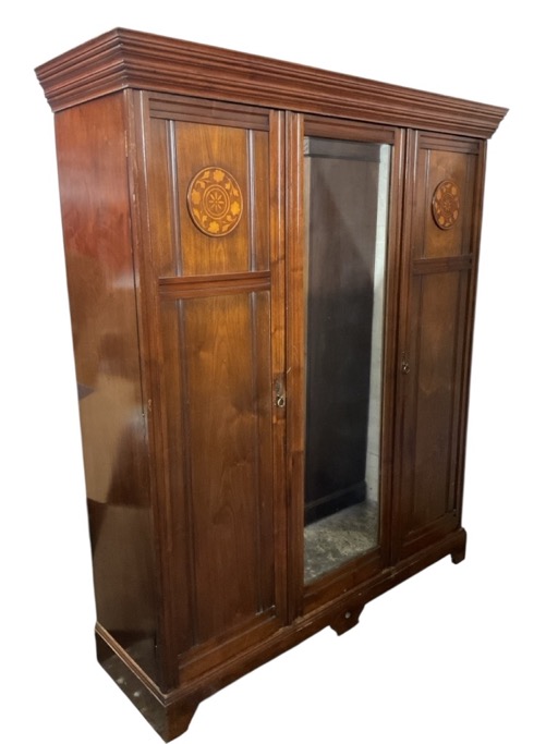 A Victorian walnut wardrobe with moulded cornice above a rectangular mirrored door flanked by brass handled panelled doors mounted with floral marquetry roundels, enclosing fitted interior, raised on bracket feet. (72in x 22.5in x 84in)