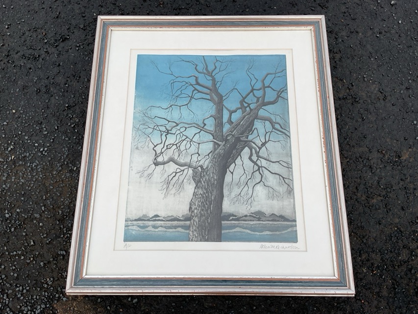Helen M Richardson, artists proof, coloured print, tree in landscape, signed in pencil on margin, mounted & framed. (13in x 16in)