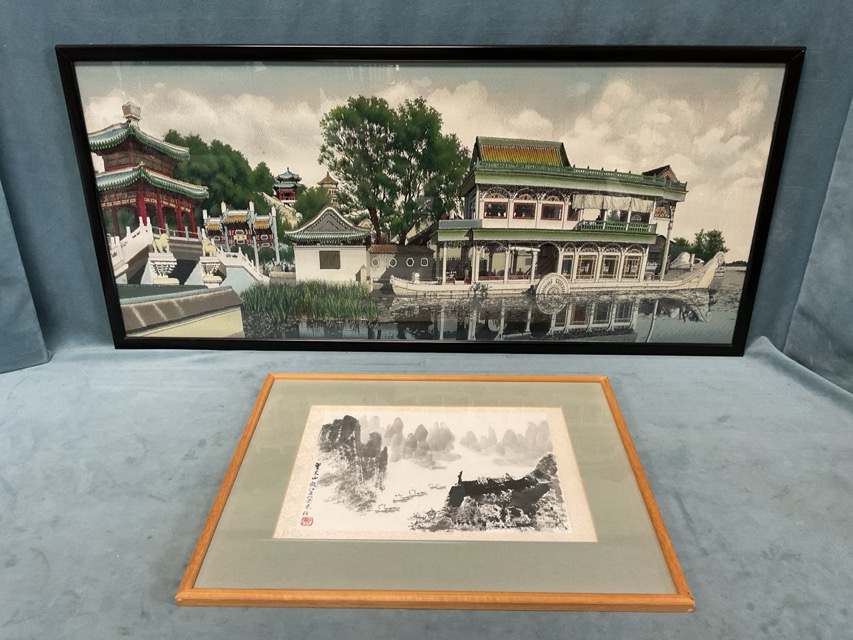 A Chinese school ink drawing on paper of a landscape with mountains and boats, signed with chop seal, mounted & framed - 12in x 8.25in; and a Chinese woven picture depicting a temple complex, framed - 35.5in x 15.5in. (2)