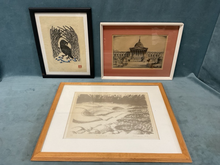 RA Chapman, monochrome lithographic print depicting the south view of Dunstanburgh Castle, numbered 3/5; Philippa Webb, engraving of a bird making a nest, numbered 3/25, signed & sealed; and an etching of University College London, signed indistinctly - all framed. (3)