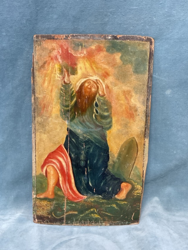 C19th oil on panel, possibly Russian naïve depiction of Moses receiving the Ten Commandments on Mt Sinai, a serpent at his feet. (9.5in x 15.25in)