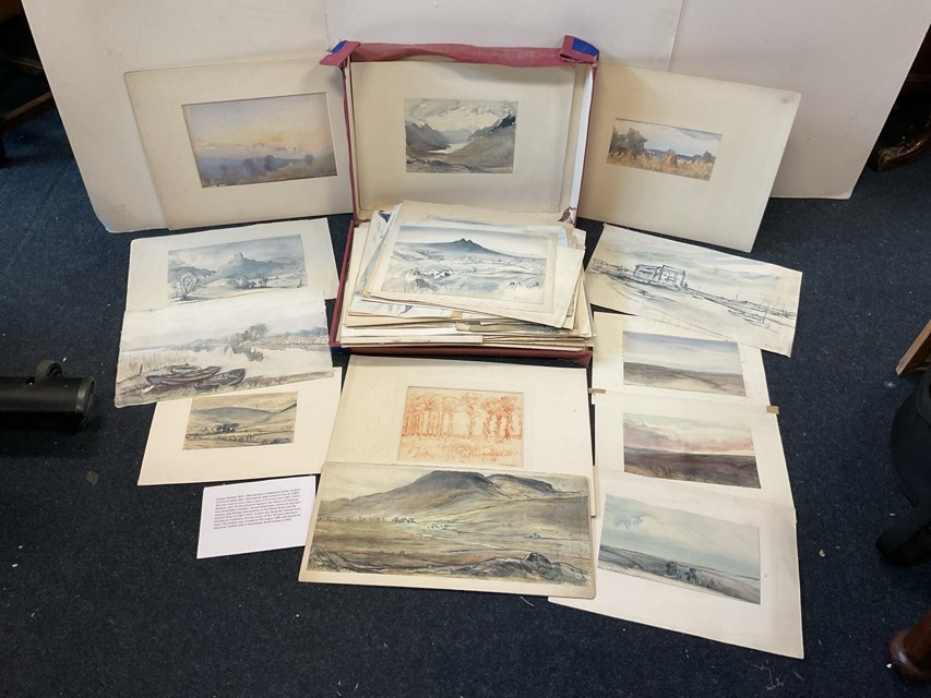 Eveleen Buckton, watercolours, pen and ink, and crayon, a collection of eighty-eight landscapes - moorland, mountains, coastal, etc., England, Wales, Scotland, Norway, Tyrol, etc., 41 unsigned, 47 signed, many mounted, various sizes. (88)