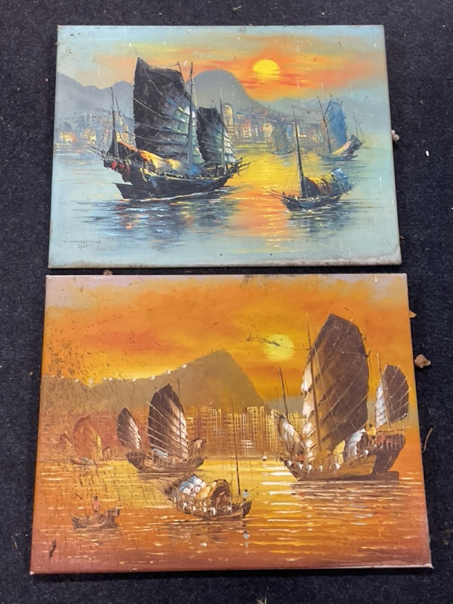 Henry Wong, oils on canvas laid on panel, Chinese junks and sampans in Hong Kong harbour at dusk, signed, unframed. (24in x 18.5in) (2)
