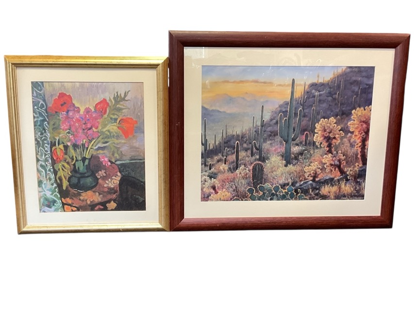 Gretchen Huber, coloured print, mountainous landscape with cacti at dusk, signed in the print, mounted and framed; and Suzanne Valadon, coloured print, oriental poppies and phlox in a jug, mounted and framed. (2)