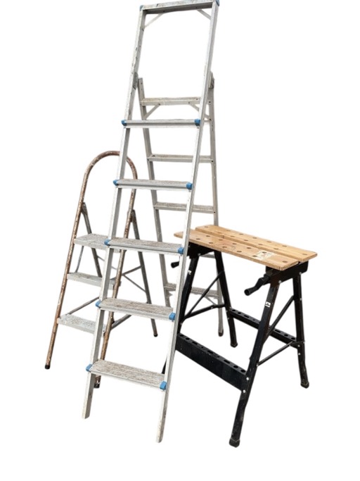 A pair of folding steps with arched rail and three treads; a workmate type folding bench with vice top; and a pair of folding ladder steps with ribbed treads. (3)