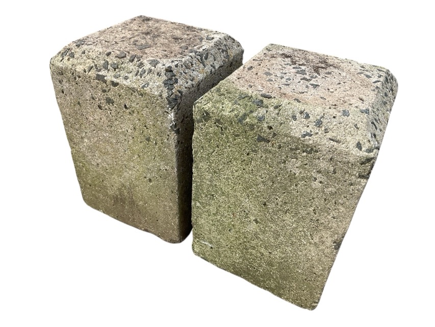 A pair of square composition stone columns or stands with chamfered edges. (9in x 9in x13.5in) (2)