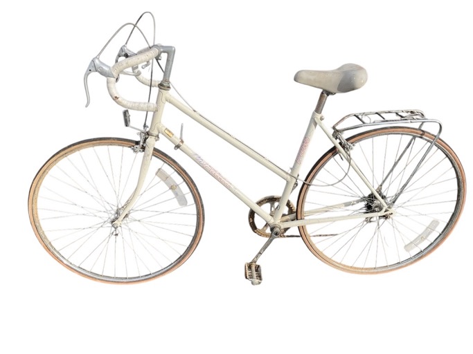 A 70s Falcon racing bicycle with drop handlebars, adjustable seat, back pannier rack, gears, etc.