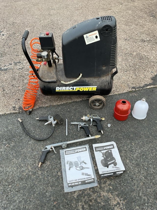 A Direct Power compressor with instruction manual and attachments, spray guns, paint cups, nozzles, etc. (A lot)