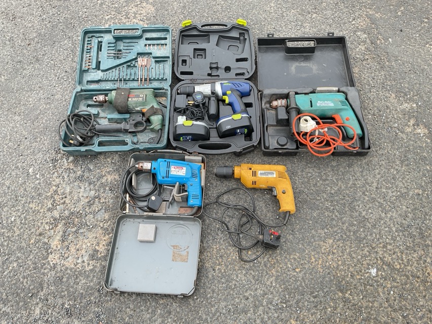 Four cased electric drills - Challenge Xtreme, Black & Decker, Bosh, and Makita; and one German uncased by Mamesmanw. (5)
