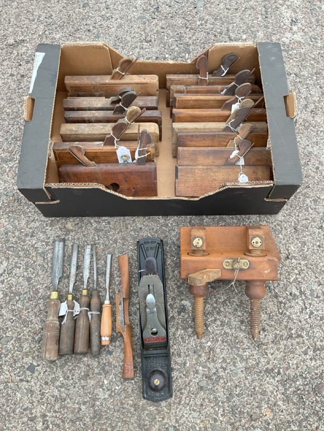 A collection of Victorian moulding planes - eight marked F.Colledge, a Dado, a right-hand snipe-bill, a Jack, a plough by Emir, etc; and other carpentry tools - chisels & a spokeshave, etc. (21)