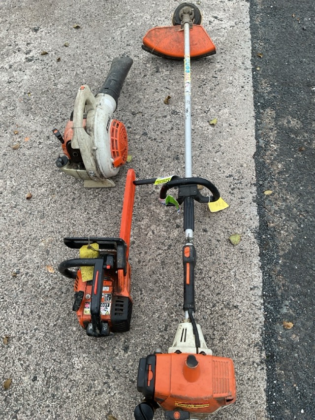 A Stihl petrol garden strimmer - model FS250; an Echo petrol powered chainsaw; and a Stihl petrol powered leaf blower - model BG56. (3)